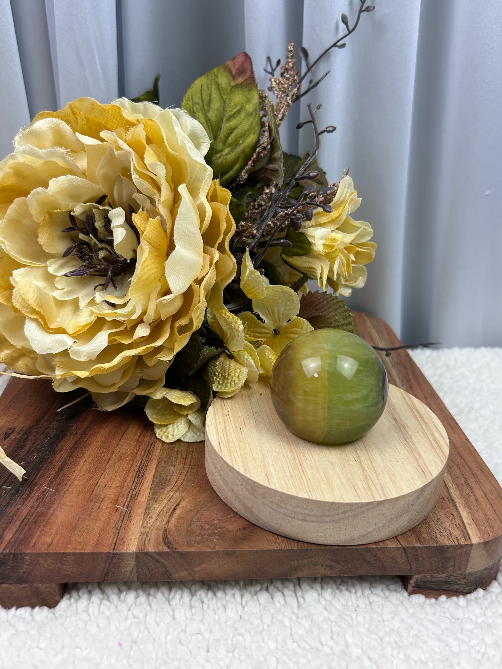 Mango Fluorite displays vivid, layered colors that transition naturally through sunny tones and soft greens. Each sphere is uniquely patterned, giving it a lively, uplifting energy that feels like holding a slice of the sun in your hands.