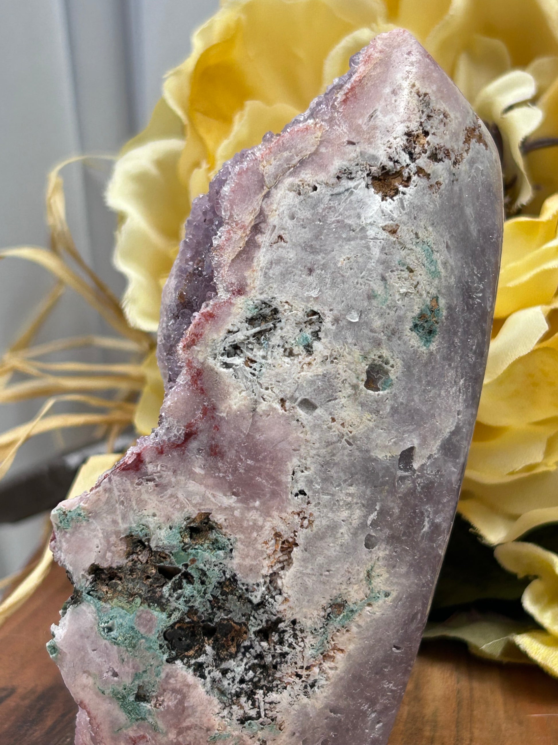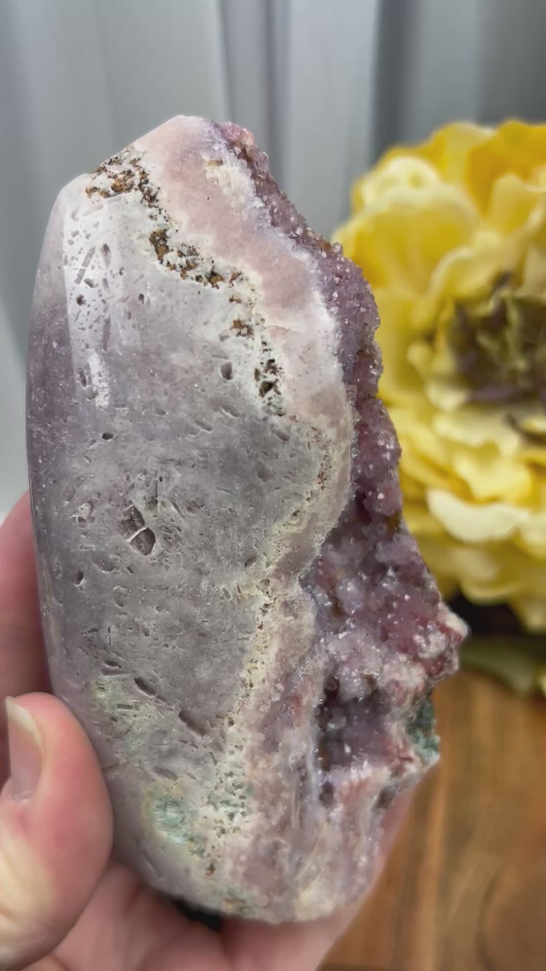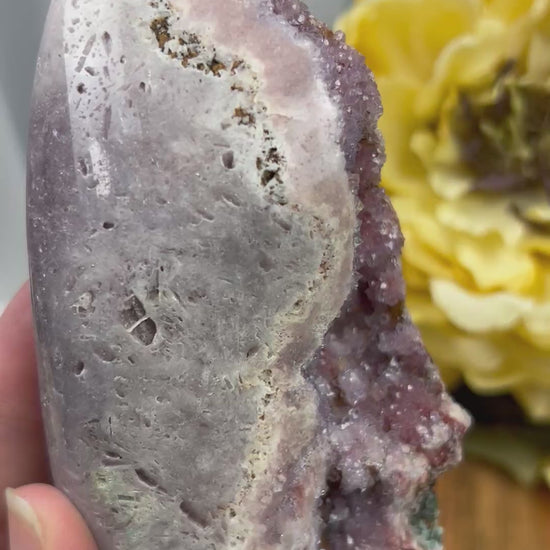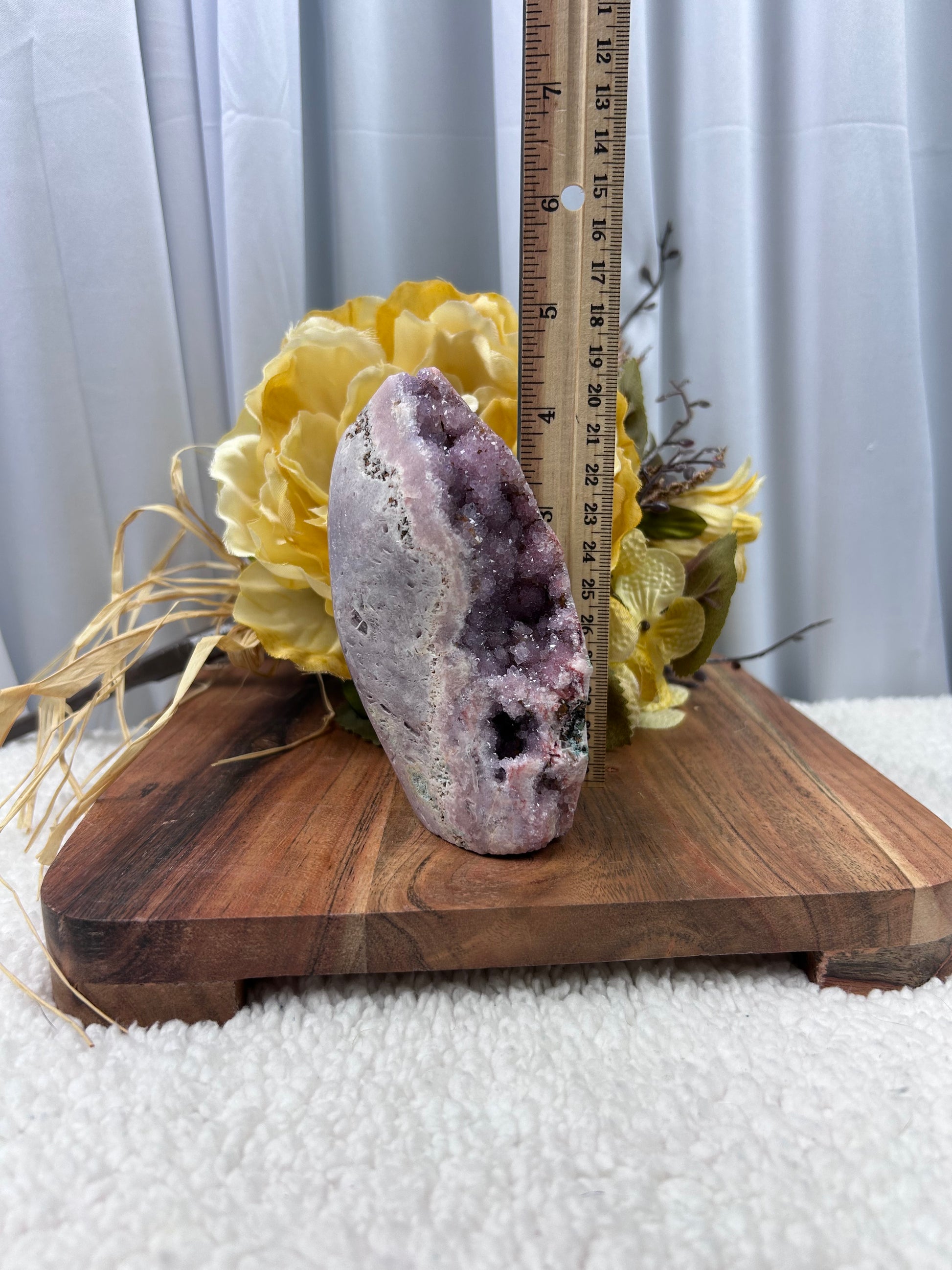 Step into a realm of quiet enchantment with this Druzy Pink Amethyst Standing Freeform, a one-of-a-kind crystal sculpted by time and crowned in natural sparkle.