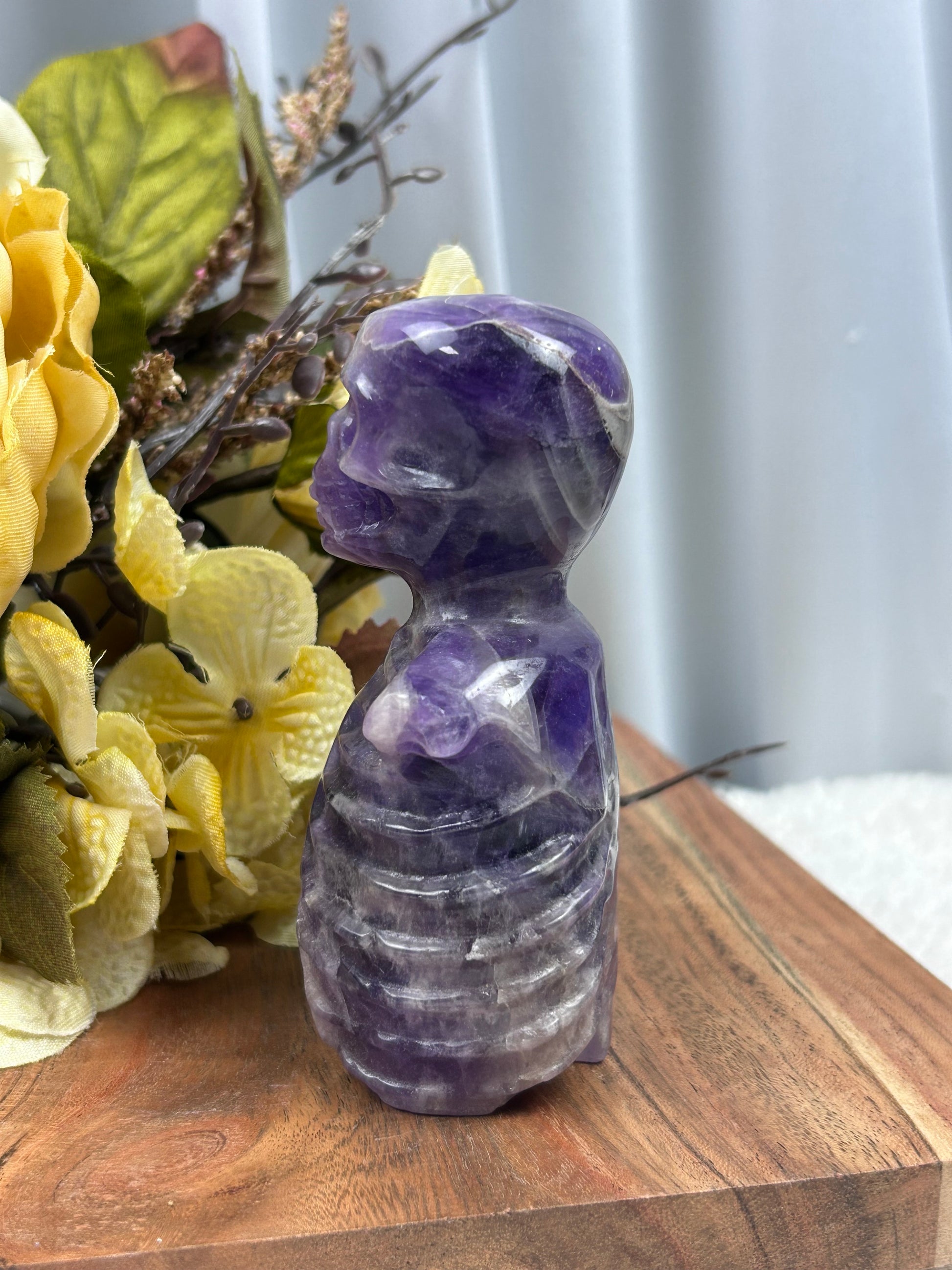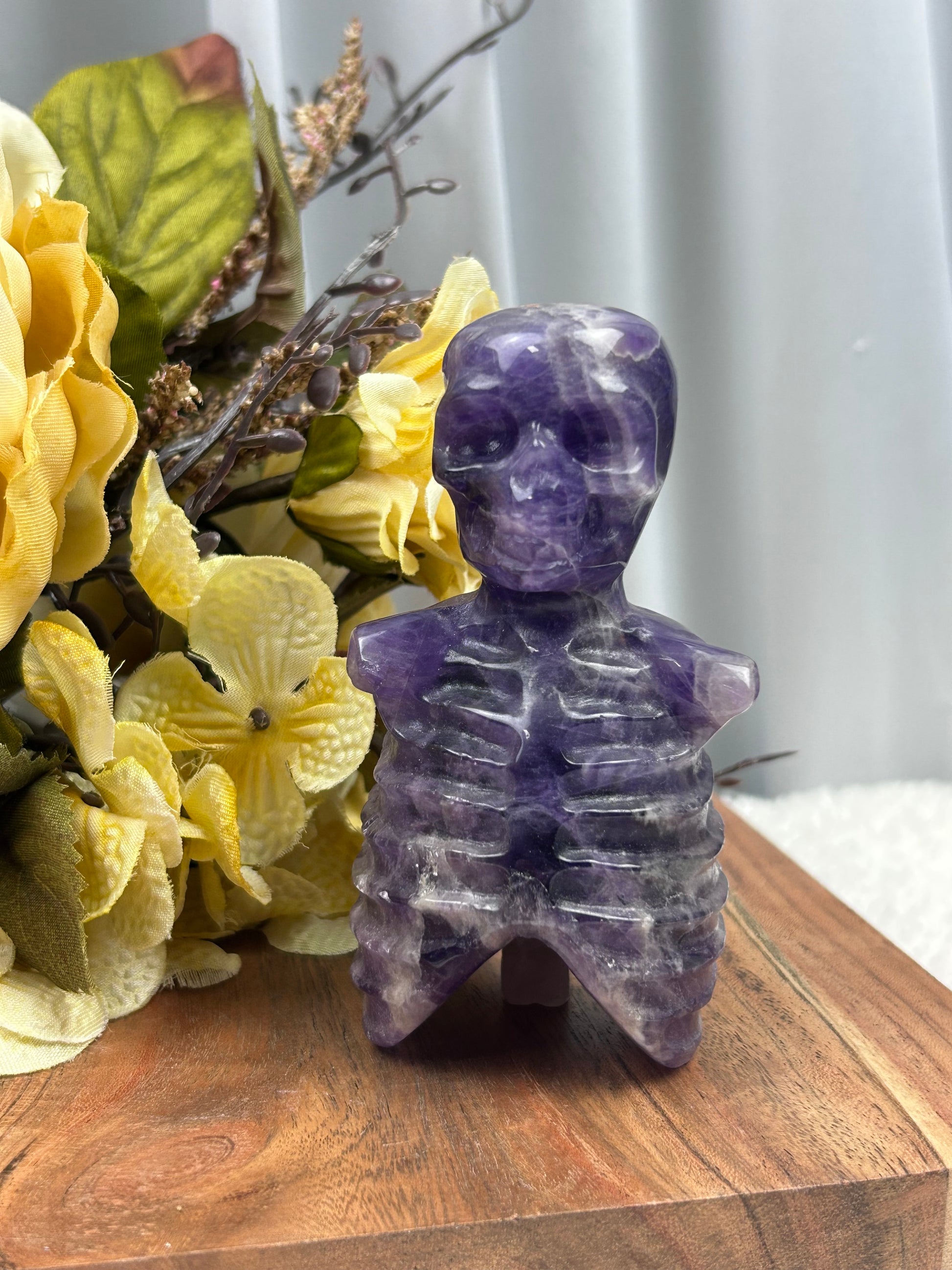 Step into the realm of intuition and ancient magic with this Dream Amethyst Skeleton Torso, a mesmerizing blend of carved bone detail and swirling violet crystal. Each piece is hand-carved to reveal an anatomical torso wrapped in dreamy bands of lavender, deep plum, and milky quartz—like a spirit drifting between worlds.